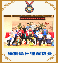•陳羽璇-國小女甲60公尺第1名國小女甲100公尺第3名•劉宸宇-國小男甲100公尺第6名國小男甲60公尺第4名•鍾皓哲-國小男甲60公尺第5名•鍾宇翔-國小男甲壘球擲遠第3名•羅敏瑄-國小女甲壘球擲遠第3名•鄧亘茹-國小女甲60公尺第5名•廖湘妍-國小女乙60公尺第3名•恭喜以上同學獲獎,並入選楊梅區代表隊