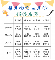 市模範生年級班級導師姓名推薦事蹟模範生感言六一陳慧芳許妍溱值得班上同學、老師信賴。本學期擔任學校自治市幹部,表現傑出。他的好表現與優點讓同學推選為本次模範生。感謝同學將成為市模範生的機會給了我,我會繼續努力!六二葉玲君徐喬薇1.看到需要幫助的同學,會盡力去幫助他2.認真學習,積極參加各項活動3.打掃工作認真負責。4.按時繳交作業,從不拖欠。5.尊重師長,待人溫和有禮。成為模範生,我深感責任重大。我會以身作則,努力學習,積極參與各項活動。我也會更重視品德修養,尊重師長,樂於助人,並促進同學的團結與向心力。六三吳京玲施沛緣1.熱心助人:會使用自己的時間幫助有困難的同學,並主動關心同學的課業。2.擔任志工:自願擔任小志工,協助整理學校的資源回收。3.克盡職責:無論是擔任班級幹部,還是學生自治市幹部,都能自動自發完成工作。4.積極進取:嘗試參加班際或校外比賽,爭取更多的學習經驗。5.學業優良:對待學習能自我要求,精益求精。首先我要謝謝全班同學選我當市模範生,既然大家選了我,在接下來的每一天我都會盡全力當大家最好的學習榜樣。再來我要謝謝老師和我的家人,在平常就教導我要有禮貌、對待師長要尊重,看到同學有困難就要伸出援手,他們對我的幫助我一定會永遠記在心裡。六四張芩瑛徐嘉熯1.五年級當選班上區模範生。2.嘉熯為人心善細膩,多次擔任班級幹部,負責盡職,令全班信任、推崇,人氣極高。3.課業優秀卻仍謙虛有禮,且獨立自主、努力上進,各項表現為品學兼優的好學生。4.私下與同學們相處,和樂融融、圓融彈性,也能包容班上需要協助的低成就孩子。從不口出惡言,總是笑臉迎人,面對挑戰!5.同學請假或受傷會主動關心及協助其任務,維持班上良好運作。謝謝大家的支持,我會更努力做個好學生!六五周永平謝官吟官吟學習態度積極且自律,及在學業表現上優異維持班排前十名,曾擔任副班長與體育股長,平時做事認真負責、待人和善有禮,並總是樂於助人,深受同學愛戴,展現難能可貴的品行,足堪表率。謝謝老師與同學的支持和鼓勵,讓我當上市模範生,我會繼續努力,不辜負大家的期待!六六施明宜丁勻佑連任兩任班長,擔任幹部認真負責,與同學相處融洽,獲得同學肯定。謝謝大家的肯定,我一定會越來越好! 潛能班林日新、蔡佳臻趙子硯學習認真、個性開朗,下課時間常主動關心幫助同學,是個小幫手。謝謝老師和同學選我當模範生,我會繼續努力!區模範生年級班級導師姓名推薦事蹟模範生感言一一劉俊德吳宗諺成績優異,學習專注,友愛同學。謝謝大家的支持,我會努力做更好!一二黃美足吳佩霓1.經常幫助有需要的同學2.熱心,用心協助師長3.友愛同學,認真負責謝謝同學的支持。一三黃婉琪吳采潔采潔擔任班長盡責,除了會協助老師,也會幫助同學,非常貼心;另外待人和善,是個好孩子。謝謝大家的支持,我會繼續努力!一四郭坤隆邱詩晴邱詩晴是一位品學兼優的好孩子,熱心助人、負責盡職、主動學習、和善謙虛,不管是待人處世或學習態度,都是同學們的學習典範。感謝大家讓我擔任模範生,未來我會表現得更好,幫助更多同學,希望大家都能開開心心過每一天!一五鍾美莉蔡崳安崳安是個學習認真且樂於助人的好孩子。常常教導課業進度落後的同學,很棒!謝謝大家。我會一直幫助需要幫助的同學,也希望同學能跟我一樣幫助大家。二一江孟涵鍾依芩依芩熱心服務,待人親切有禮,愛閱讀又博學多聞,聰明能幹是老師的好幫手。謝謝同學們對我的支持,讓我當上模範生,我會繼續努力做好大家的榜樣,謝謝大家。二二陳美月黎凡華1.遵守規矩、尊敬師長。2.對待同學溫和講理,樂意助人。3.做事情負責盡職,學習上腳踏實地。謝謝老師和同學的支持與鼓勵,我會繼續努力。二三楊彩貝魏宜萱宜萱態度溫和,成績優秀,每日準時到校,上課會趕快回教室坐好,師長交代事情或提出問題會注意聽,眼神專注看老師,有時會分享自己的想法,作業按時交,是一個守秩序的孩子。宜萱好溝通、好協調,打掃時候認真做事,跟同學共同完成事情,效率好又快。擔任班長期間,協助老師集合和帶領全班進行活動,認真負責,表現優秀。謝謝大家!我會繼續努力。二四林佩芳鄧瑀晴待人謙和有禮,個性溫柔熱心,時常主動幫助同學,也會細心教導同學作業。學習用心,喜愛閱讀,思考能力強。堪為模範。得到模範生對我來說,不僅僅只是一個榮耀,更代表著老師和同學們對我的認同,謝謝佩芳老師和同學的支持!我真的很喜歡二年四班的同學,希望我們可以一直開心的玩在一起!二五羅翊瑄李欣霈尊師重道且品學兼優,心地善良、有愛心;待人親切、喜歡幫助別人,做事盡責勤奮,人緣佳。我很榮幸當上這次的模範生,我會繼續努力。三一莊政圜姜柏誌柏誌活潑開朗、守分有禮,能夠遵守團體的規範與紀律,與同學相處融洽,擔任班長工作負責認真,盡職守份並且在群體中表現合宜的行為。學習努力認真,課業按時完成,期能繼續加油努力,更進一步!謝謝大家選我當模範生,我很喜歡幫老師處理班上的大小事,謝謝老師和同學選我當模範生,我很開心又驚訝!謝謝老師和同學支持我。三二廖淑佳徐祤芯1.成績優異,謙遜有禮。2.尊師重道,友愛同學。3.守信用,愛乾淨。謝謝大家的愛戴,我會繼續加油,努力做好典範。三三朱光超姜欣妤做任何事都無怨無